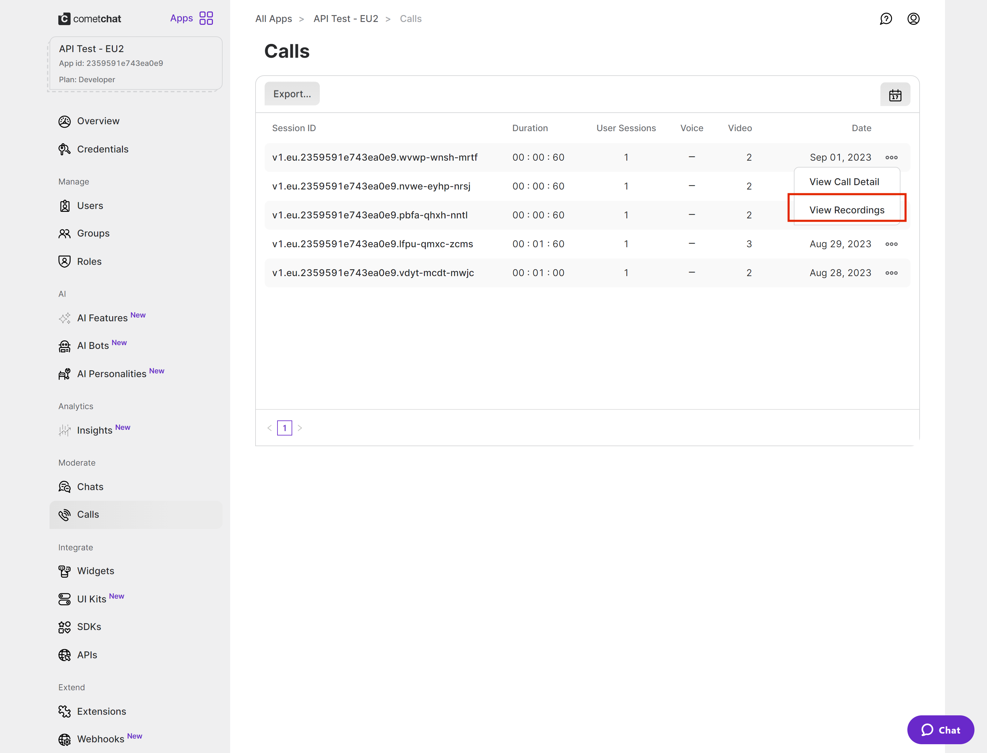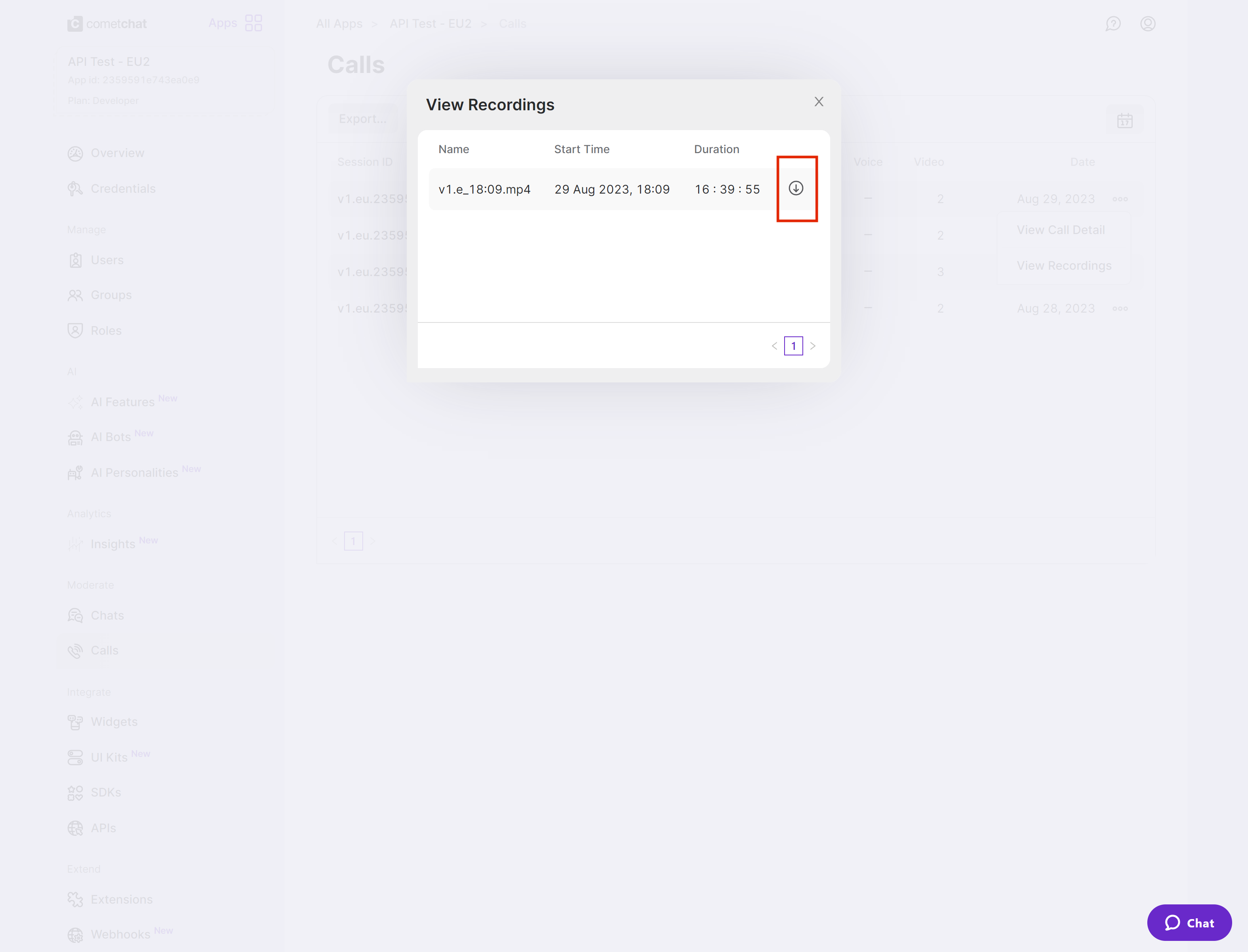 Currently, the call recordings are available on the CometChat Dashboard under the Calls Section. Recordings can be accessed after clicking on the three dots menu icon to expand the menu and then select “View Recordings”. You can refer to the below screenshot. You can refer to the below screenshot.