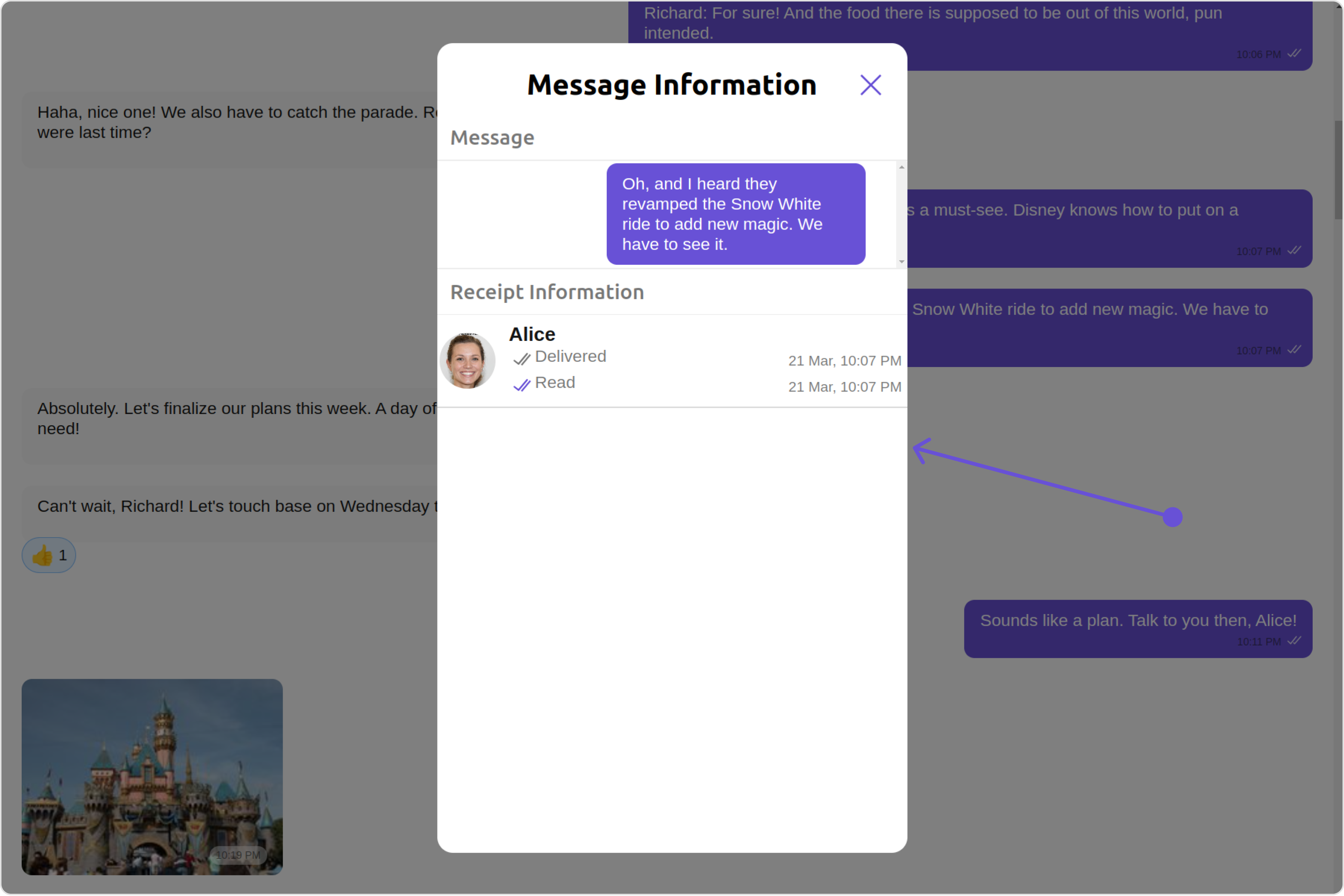 | deliveredIcon | string | Sets the custom icon resource for delivered receipts in the message information view. |