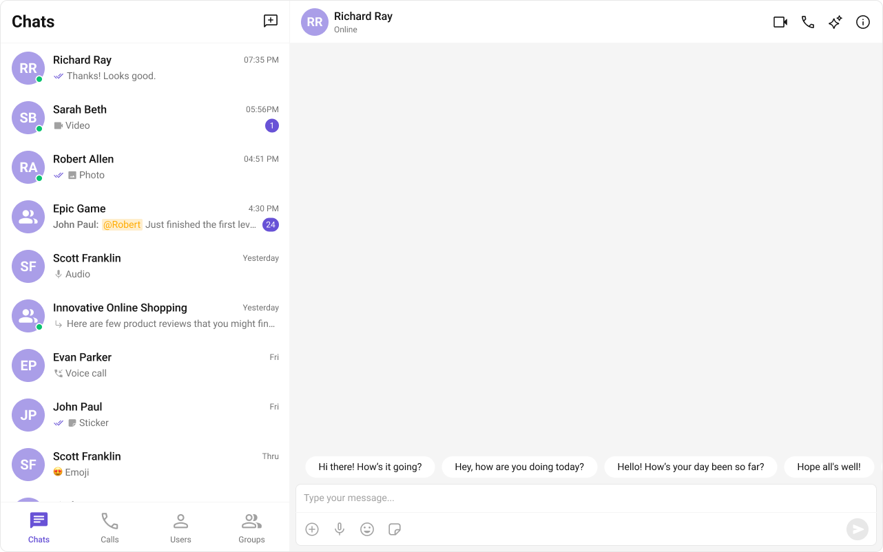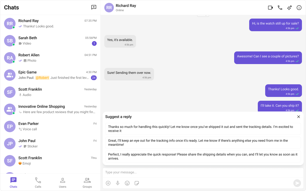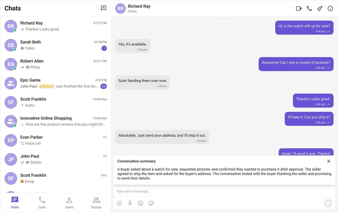 | AI features | Conversation Starter, Smart Replies, Conversation Summary |