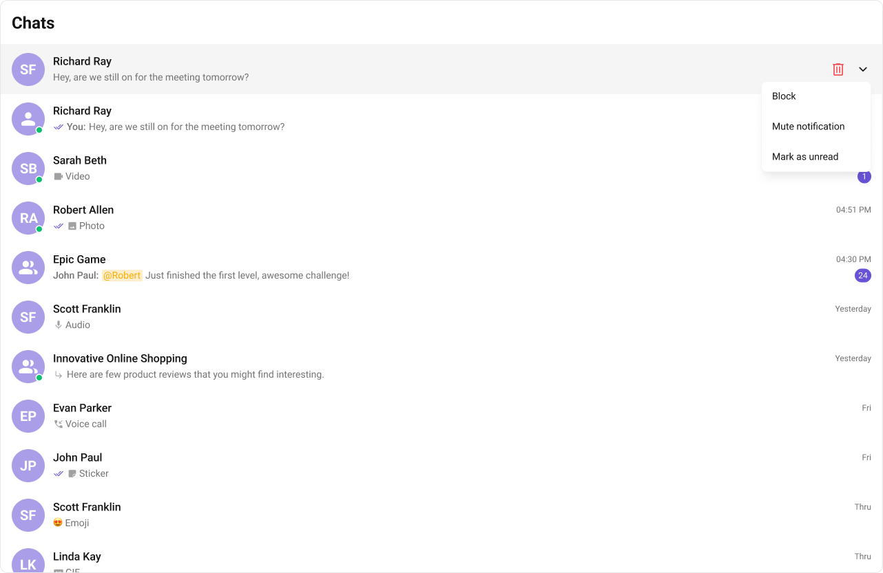 onUserOnline / onUserOffline | Updates online/offline status dot (unless hideUserStatus={true}) |
