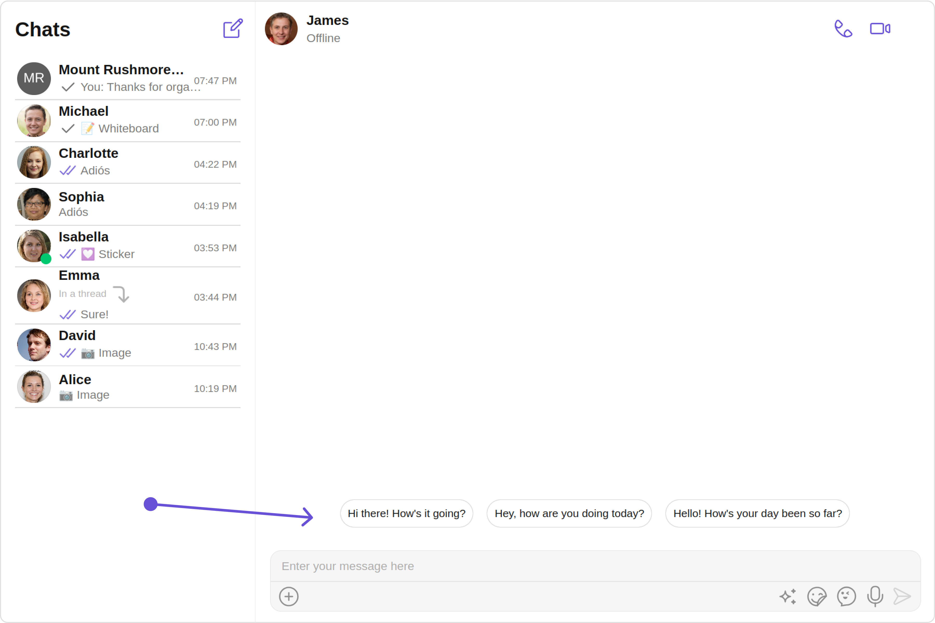 When a user initiates a new chat, the UI kit displays a list of suggested opening lines that users can select, making it easier for them to start a conversation. These suggestions are powered by CometChat’s AI, which predicts contextually relevant conversation starters. For a comprehensive understanding and guide on implementing and using the Conversation Starters, refer to our specific guide on the Conversation Starter. Once you have successfully activated the Conversation Starter from your CometChat Dashboard, the feature will automatically be incorporated into the MessageList Component of UI Kits.